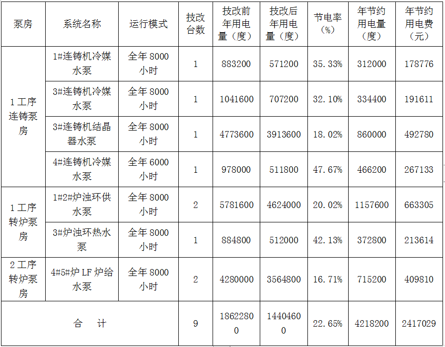 2.1項(xiàng)目目標(biāo):按照貴司提供的運(yùn)行模式,結(jié)合本節(jié)能技改方案,此節(jié)能技改項(xiàng)目平均節(jié)電率約為 22.6 %,年節(jié)電量約為4218200度,按照電價(jià)0.573元/度,預(yù)計(jì)平均每年可節(jié)約電費(fèi)2417029元。