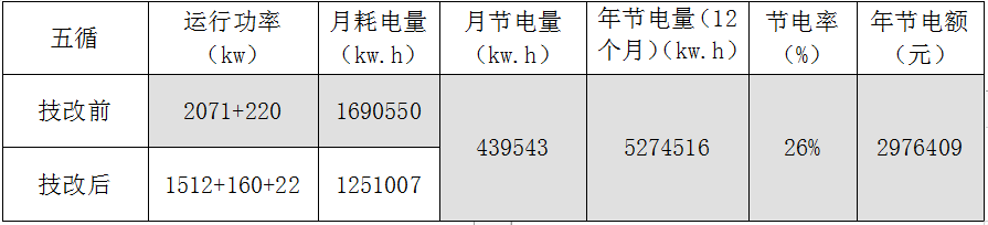 本節能技改項目將實現年節電量(每年按12個月計算)44×12=528萬度以上,實現節電率在26% 左右,在當前電價水平下(按 0.5643 元/度)將實現年節約電費297.6萬元。